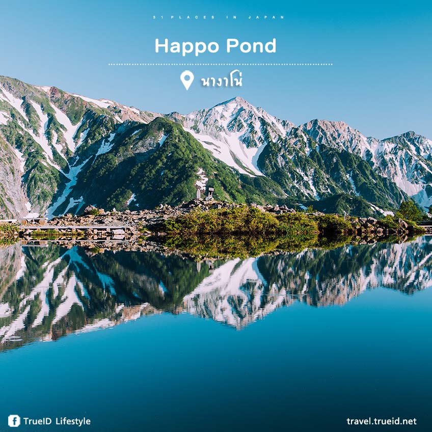 Happo Pond ตั้งอยู่ในบริเวณอุทยานแห่งชาติของนากาโน่ รู้จักกันในชื่อของสถานที่เหมาะกับการเล่นสกีในฤดูหนาว แอ่งน้ำนี้อยู่ในภูเขาที่มีความสูงถึง 2,060 เมตรจากระดับน้ำทะเลเลยทีเดียว แน่นอนว่าวิวตรงนี้สวยงามจับใจค่ะ